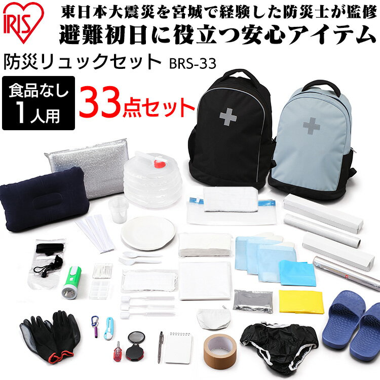 【2025年9月1日にミニ電源セットを追加しました】 災害時に役立つ用品33点をセットにした防災リュックです。