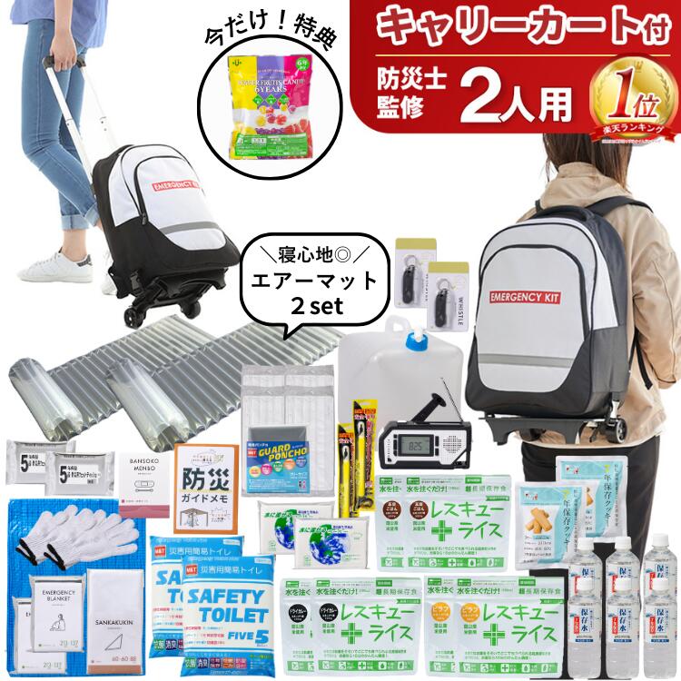 【シリーズ累計51万セット突破!】キャリーカート付き防災リュックなので、水など重たい荷物も運べて便利![7年保存食] 防災セット 二人用 キャスター付き 必要なもの スマホ充電