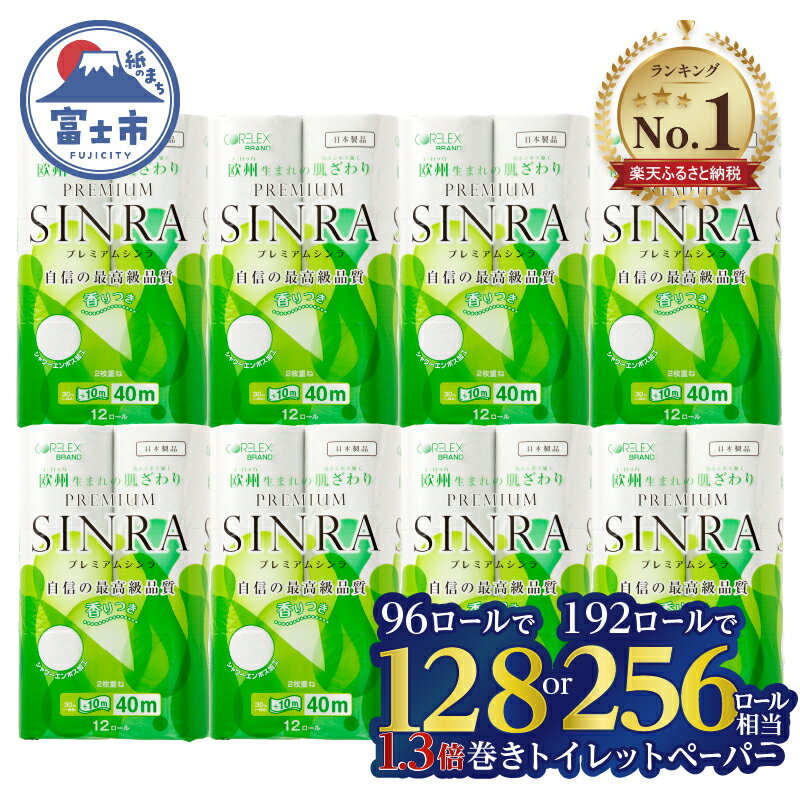 【ふるさと納税】【総合ランキング第1位獲得!】128/256ロール相当 トイレットペーパー ダブル 「プレミアムシンラ」 96/192ロール (12R×8/16P) 長持ち 香り 消臭 再生紙100% 備蓄 防災 日用品 生活用品 人気 総合 ランキング 送料無料 富士市[sf001-012][sf001-017]