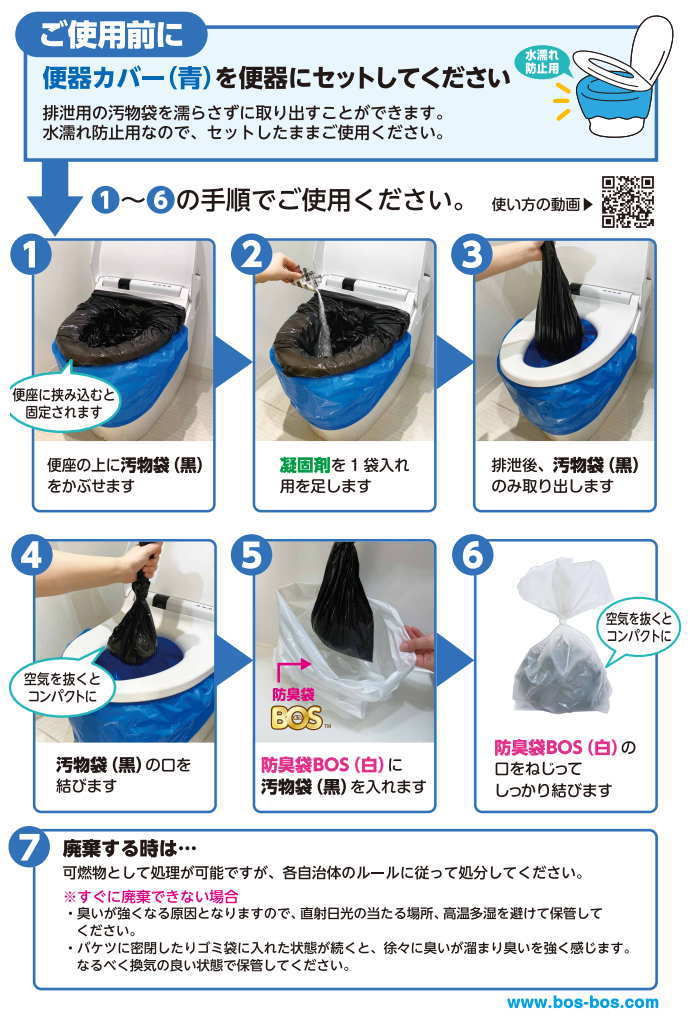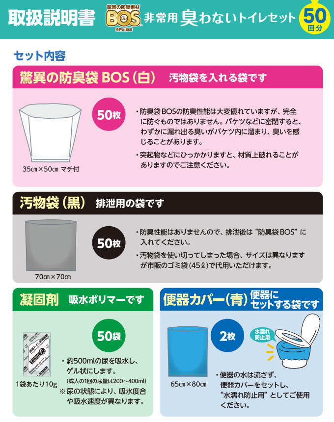 商品の仕様 ●重さ/2.3kg ●材質/ポリエチレン、他 ●セット内容/驚異の防臭袋BOS、凝固剤、汚物袋、便器カバー、取扱説明書 ●生産国/日本 商品の説明 ・医療向け開発から生まれた驚きの防臭力! ・快適:驚異の防臭力で臭いをとじこめる! ・便利:今あるトイレがすぐに使える! ・簡単:設置も後処理も簡単! ・衛生:金も漏らさず衛生的! ・省スペース:コンパクトで備蓄に便利! ※特注の大きな便器や簡易トイレなどには、汚物袋や便器カバーが設置できない場合がございますので、開口部の外周をご参照いただき、事前にトイレに設置できるかご確認ください。
