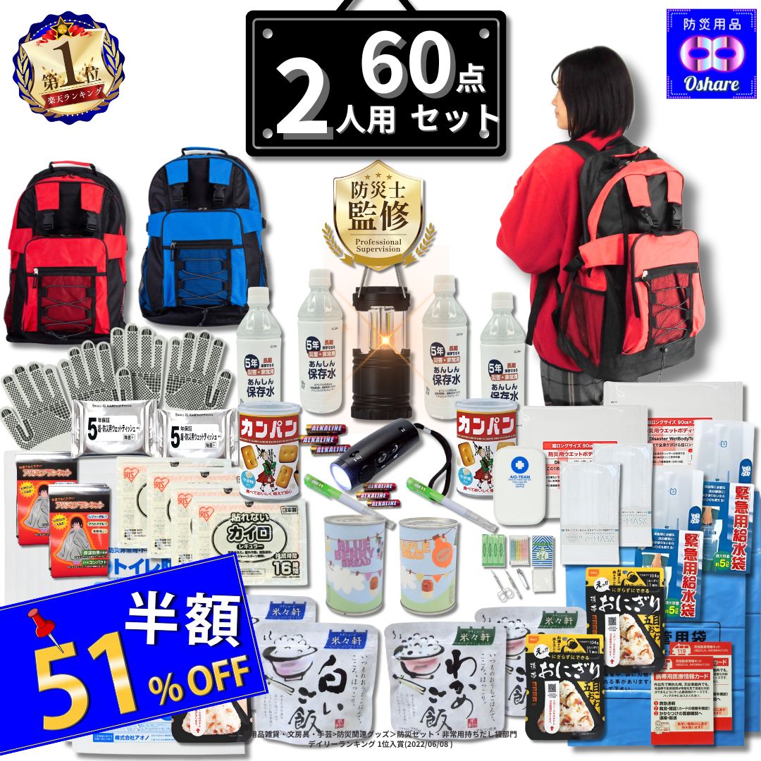 \51%OFF!/ 防災セット 2人用 サバイバル 60点 2人 の命を守る 防災グッズ 防災リュック 防災 【 防災バッグ 災害グッズ 1人用 1人 3人用 3人 家族用 家族 女性用 子供用 中身だけ 災害 保存食 非常食 ランキング 1位 防災用品 オシャレ 】