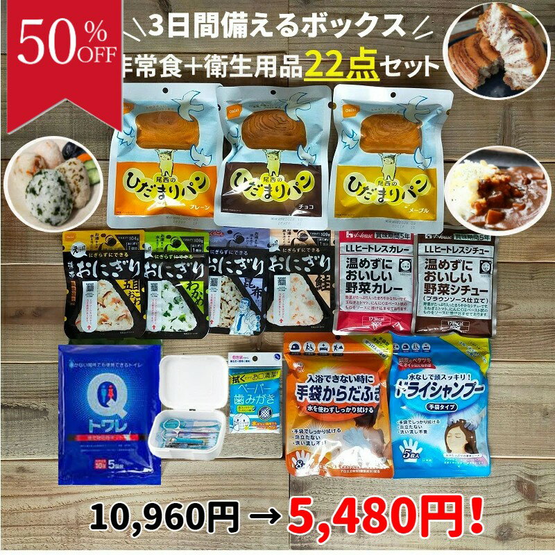 セット内容1ひだまりパン(プレーン)2ひだまりパン(チョコ)3ひだまりパン(メープル)4携帯おにぎり(鮭)5携帯おにぎり(わかめ)6携帯おにぎり(昆布)7携帯おにぎり(五目おこわ)8ハウス 温めずに美味しい野菜カレー9ハウス 温めずに美味しい野菜シチュー10Qトワレ 5回分11ペーパー歯みがき 5包12手袋からだふき せっけんの香り(7枚入)13手袋シャンプー(5枚入)14キズテープM(3枚入)15ワンタッチ包帯16コットンパフ(3枚入)17爪切り18エチケットハサミ19耳かき20爪ヤスリ21毛抜き兼ピンセット22カラー綿棒(10本入)「非常食だけじゃ足りない!“水”も一緒に備えて、暮らしに安心を。
