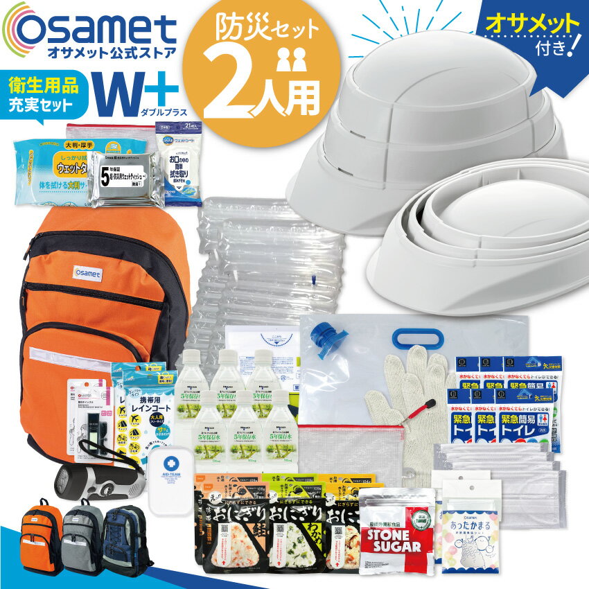 防災リュック 折り畳みヘルメット 付き 防災セット 2人用 W+ オサメット 防災用品 保存食 保存水 ラジオ ライト 簡易トイレ 防災バッグ 災害時 緊急時 防災 ヘルメット 避難セット 持ち出し袋 防災リュックサック 非常用持出袋 家族 夫 避難 災害用 防災リュック ATR