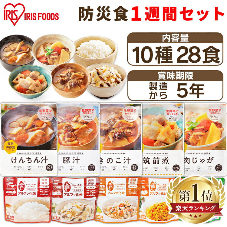 【P5倍★16日10時迄】非常食セット 7日分 非常食 ごはん おかず スープ 10種28食セット 製造から5年保存 防災食 アルファ米 白米 保存食 防災 食品 備蓄 米 食料 レトルト食品 常温保存 長期保存食 備蓄食料 アイリスオーヤマ アイリスフーズ *