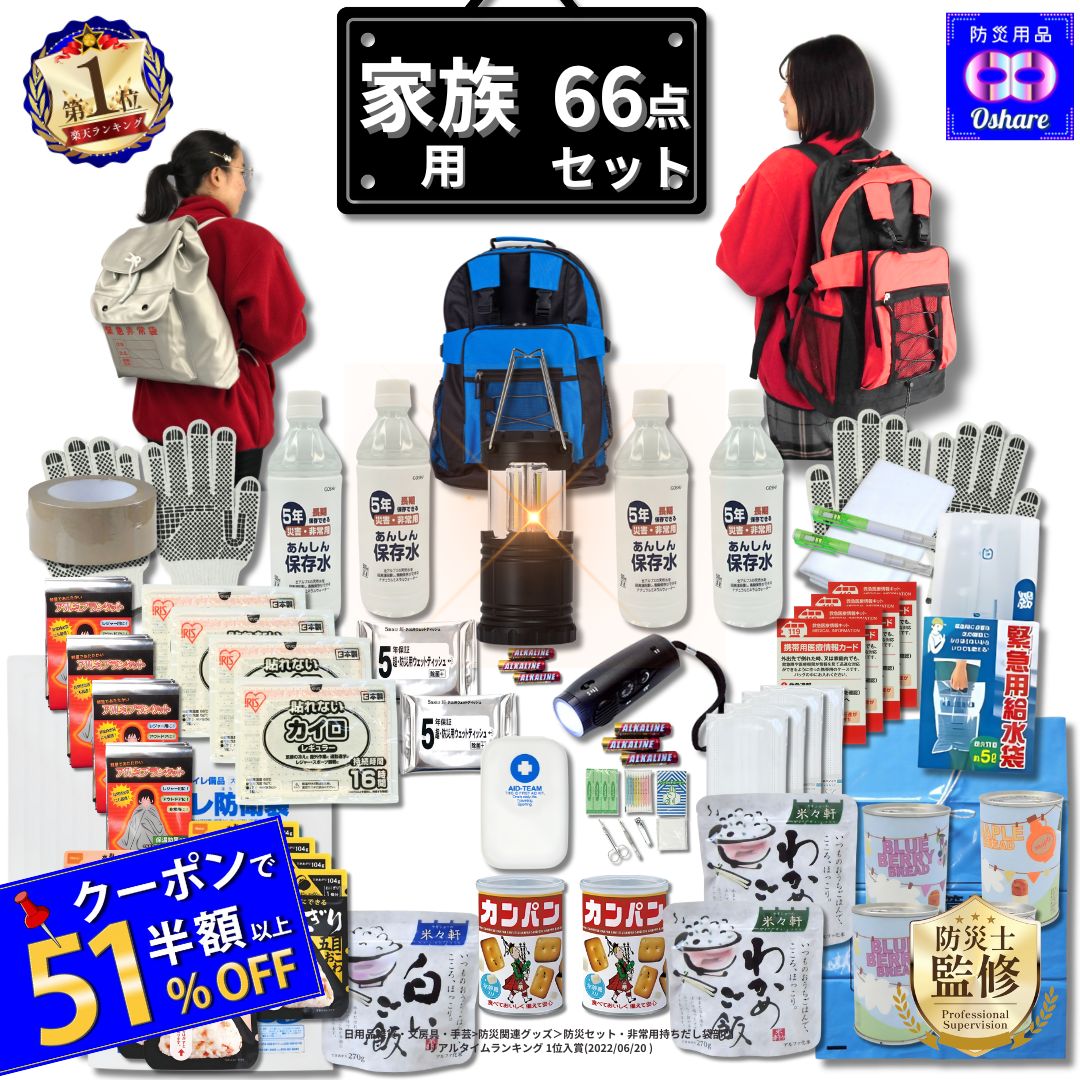 ・・・この商品の「い ち お し」ポイント・・・ ●もしもの時、すごく役立つ 防災グッズ を"被災者の声"より厳選し、セットした 防災セット 66点 家族 用です。