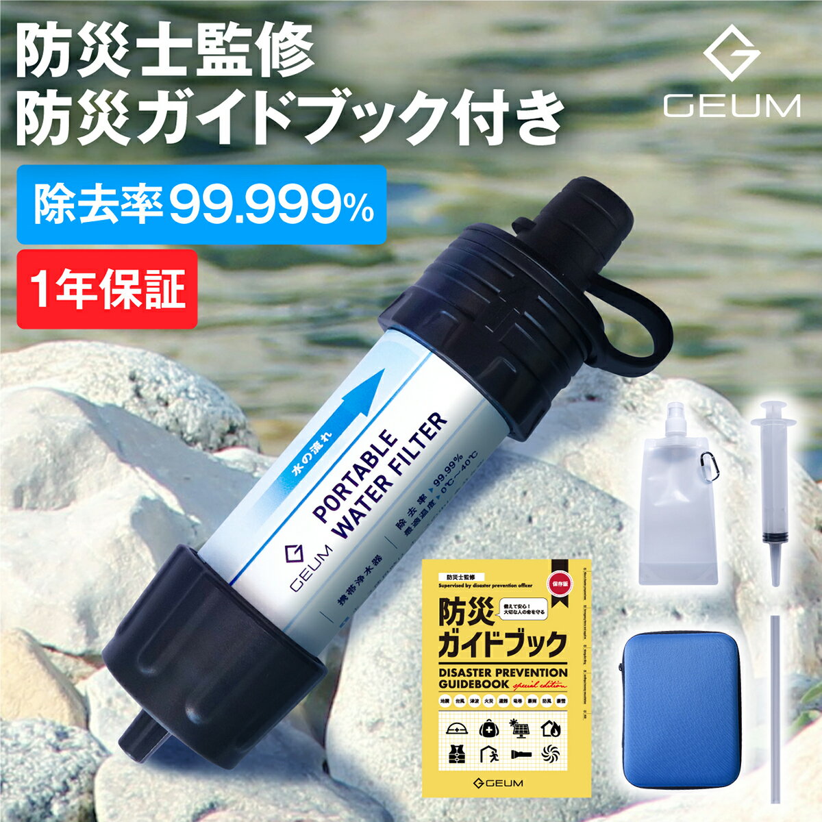 【楽天SSクーポン!高評価★4.5】携帯浄水器 携帯用浄水器 除去率 99.999% 5000L 浄水器 防災グッズ 防災士監修 収納ケース 軽量 コンパクト アウトドア サバイバル 地震 災害 【1年保証&説明書&防災ガイドブック付き】