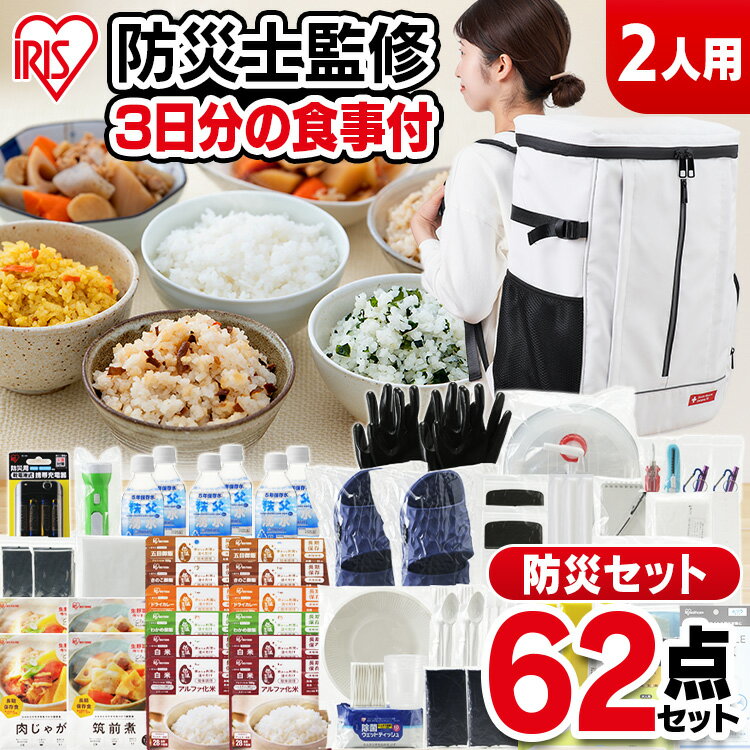 ▼セット内容/リュック含む合計62点 <情報・照明> ・懐中電灯ランタン(単3形乾電池×2本・別売り) ・長期保存単3形乾電池4本パック ・スマートフォン対応乾電池式携帯充電器(単3形乾電池×8本入り) <寝具・防寒> ・エア枕×2個 ・アルミブランケット×2枚 <衛生用品> ・携帯用トイレ3個×2セット ・綿棒×20本 ・マスク(ふつうサイズ)7枚入り ・歯ブラシ3本×2セット ・からだ拭きシート ・ティッシュペーパー ・ウェットティッシュ10枚入り×3個 <食事> ・ラップ ・ウォータータンク5L ・割りばし×3膳 ・紙皿×3枚 ・スプーン・フォークセット×2セット ・プラカップ×5個 ・保存水500mL×6本 ・レトルト食品(肉じゃが・筑前煮×各2食) ・アルファ化米(白米×4食、五目御飯・わかめ御飯・きのこ御飯・ドライカレー×各2食) <移動> ・レインポンチョ×2着 ・ラバー手袋×2セット <その他> ・リュック ・タオル×2枚 ・ポリ袋 ・EVAサンダル(26cm)×2足 ・筆記用具セット ・防水スマホ袋×2個 ・ホイッスル×2個 ・カッターナイフ ・2WAYドライバー (検索用:防災セット 2人用 62点 アイリスオーヤマ 防災グッズ 防災用品 防災リュック 避難セット 避難リュック 非常食 保存食 災害用トイレ 携帯トイレ 保存水 水 防災 災害 避難グッズ 災害セット 食料 2人 災害用品 災害備蓄食品 二人用 食品付 4967576557863) 最強翌日配送対象商品に関するご案内 最強翌日配送対象商品・対象地域に該当する場合は最強翌日配送マークがご注文カゴ近くに表示されます。