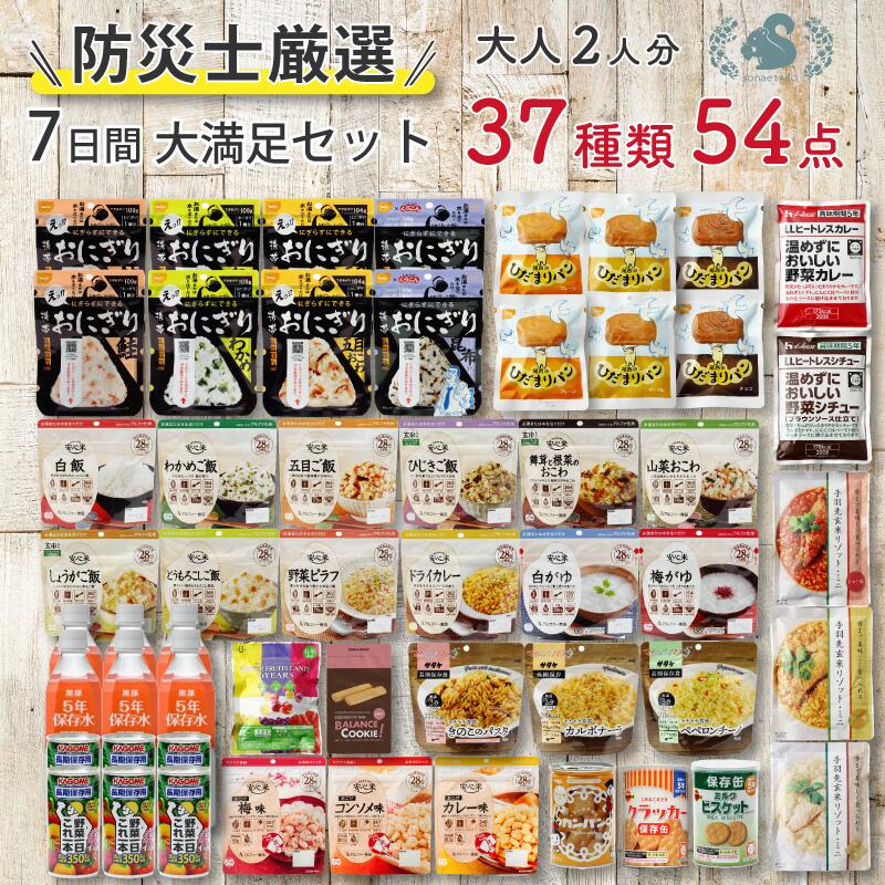セット内容1安心米(白飯)2安心米(五目ご飯)3安心米(わかめご飯)4安心米(ひじきご飯)5安心米(とうもろこしご飯)6安心米(舞茸と根菜のおこわ)7安心米(山菜おこわ)8安心米(野菜ピラフ)9安心米(ドライカレー)10安心米(白がゆ)11安心米(梅がゆ)12安心米(しょうがご飯) 13ハウス 温めずに美味しい野菜カレー14ハウス 温めずに美味しい野菜シチュー15ひだまりパン(プレーン)2個16ひだまりパン(メープル)2個17ひだまりパン(チョコ)2個18携帯おにぎり(鮭)2個19携帯おにぎり(わかめ)2個20携帯おにぎり(昆布)2個21携帯おにぎり(五目おこわ)2個22hokka カンパン23ブルボン 缶入ミニクラッカー24ブルボン ミルクビスケット25バランスクッキー(バターロースト風味)26パワーフルーツキャンディ27おこげ(コンソメ味)28おこげ(カレー味)29おこげ(梅味)30手羽先玄米リゾットミニ(トマト味)31手羽先玄米リゾットミニ(和風味)32手羽先玄米リゾットミニ(カレー味)33マジックパスタ(ペペロンチーノ)34マジックパスタ(カルボナーラ)35マジックパスタ(きのこパスタ)36カゴメ野菜1日これ1本 6本37黒部の5年保存水 6本限定特典食器セット(紙皿 4枚、プラスプーン 4個、紙ナプキン 8枚、除菌シート 10枚入1個、防臭ゴミ袋 1枚)合計全37種 54点飽きずに食べられる7日間大きなストレスを感じる災害時こそ、食べることが楽しみになるような非常食を準備しておくことが重要です。