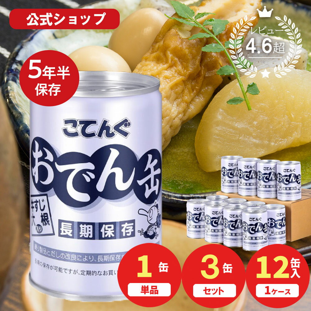 【商品名】おでん缶 こてんぐ(長期保存 5・5年保存) 牛すじ大根入り 【入数】1缶/3缶/12缶 【カロリー(1缶・内容量280g当たり)】104kcal(※つゆも含む) 【缶型】7号缶 【原材料名】こんにゃく(国内製造、中国製造)、大根、うずら卵、調味液[たん白加水分解物、だし抽出物(かつお削りぶし、焼きあご、昆布)、砂糖、還元水あめ、食塩、酵母エキス]、ちくわ、さつまあげ、牛肉、食塩/ソルビトール、調味料(アミノ酸等)、加工デンプン、乳化剤、水酸化Ca、(一部に小麦・卵・牛肉・大豆を含む) 【内容量】280g 【賞味期間】製造後5年6ヵ月間※現在出荷中の商品の賞味期限はお問い合わせ下さい 【製造者】天狗缶詰株式会社 名古屋市中区金山1-12-14 ※上記は予告なく変更する場合がございます ▼栄養成分表示(1缶内容量280g当たり) ━━━━━━━━━━━━━━ ・熱量:104kcal ・たんぱく質:8.7g ・脂質:3.6g   -飽和脂肪酸:0.94g ・炭水化物:10.0g   -糖質:8.3g   -食物繊維:1.7g ・食塩相当量:3.15g ━━━━━━━━━━━━━━ (サンプル品分析による推定値) ※栄養成分は予告なく表示が変更される場合がございます。