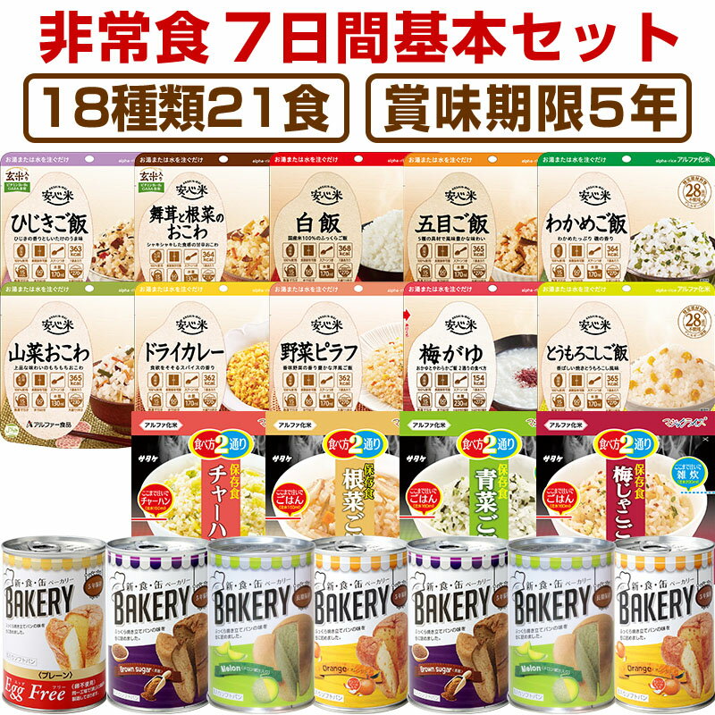 非常食7日間基本セット 賞味期限 【製造から5年】 アルファ米・保存パン※流通の段階で多少のお時間がかかるため、お手元に届く際には賞味期限が5年を切る場合もございます(賞味期限4年6ヶ月以上を保証) 内 容 量 【アルファ米】 ・安心米 ドライカレー  100g ・安心米 山菜おこわ  100g ・安心米 とうもろこしご飯  100g ・安心米 野菜ピラフ  100g ・安心米 舞茸と根菜のおこわ  100g ・安心米 ひじきご飯 玄米入り  100g ・安心米 五目ご飯  100g ・安心米 わかめご飯  100g ・安心米 白飯  100g ・安心米 梅がゆ  42g ・マジックライス 根菜ご飯  100g ・マジックライス チャーハン  100g ・マジックライス 青菜ご飯  100g ・マジックライス 梅じゃこご飯  100g ※在庫状況によって変更になる場合があります。