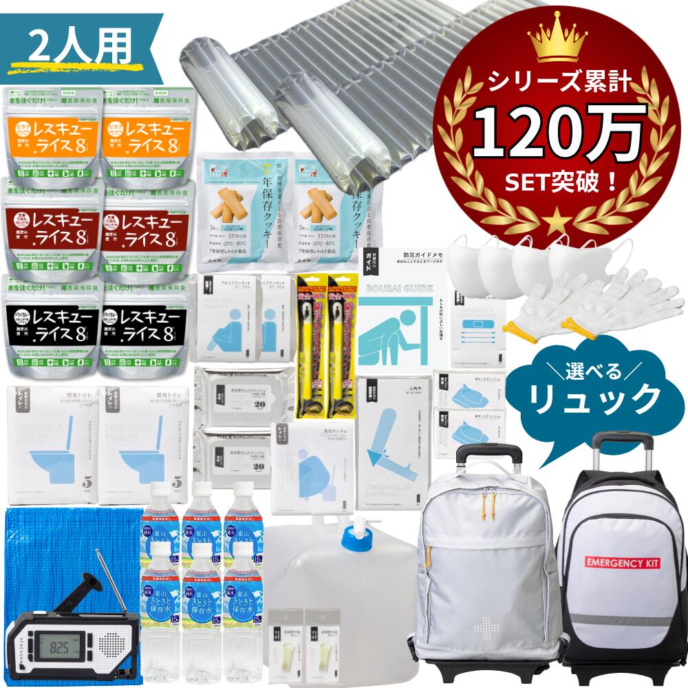 商品名 キャリー付き防災セット(2人用)8-1750n セット内容 ・キャリーカート付きリュック・マルチレスキューライト・5年保存水500ml×6・レスキューライス×6(ドライカレー・ピラフ・五目ごはん各2)・7年保存クッキー×2・簡便エアーマット×2・携帯トイレ(1袋5回分)×2・簡易ポンチョ・ブルーシート・静音アルミブランケット×2・ウォータータンク10L×1・防災簡易ライト×2・三角巾・蓄光笛×2・使い捨てマスク×4・水に流せるティッシュ×2・絆創膏&綿棒・軍手×2・ウェットティッシュ×2・防災ガイドメモ 【全22種42点】 ※在庫状況により一部商品を変更する場合がございます。
