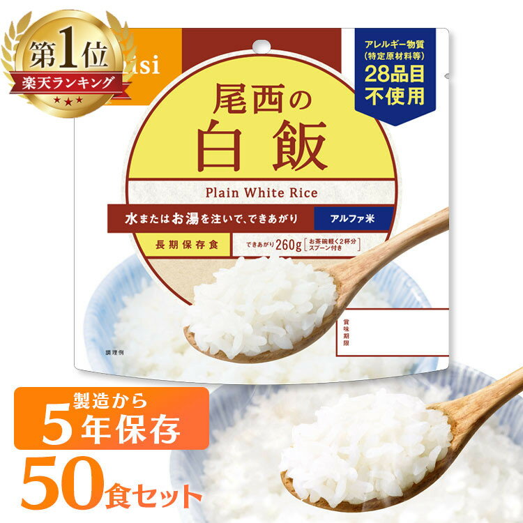 【50食セット!】お湯を注いで15分でできあがる非常時にも心強い尾西のアルファ米! お湯でも水でもたった15分でふっくらご飯が出来上がります。