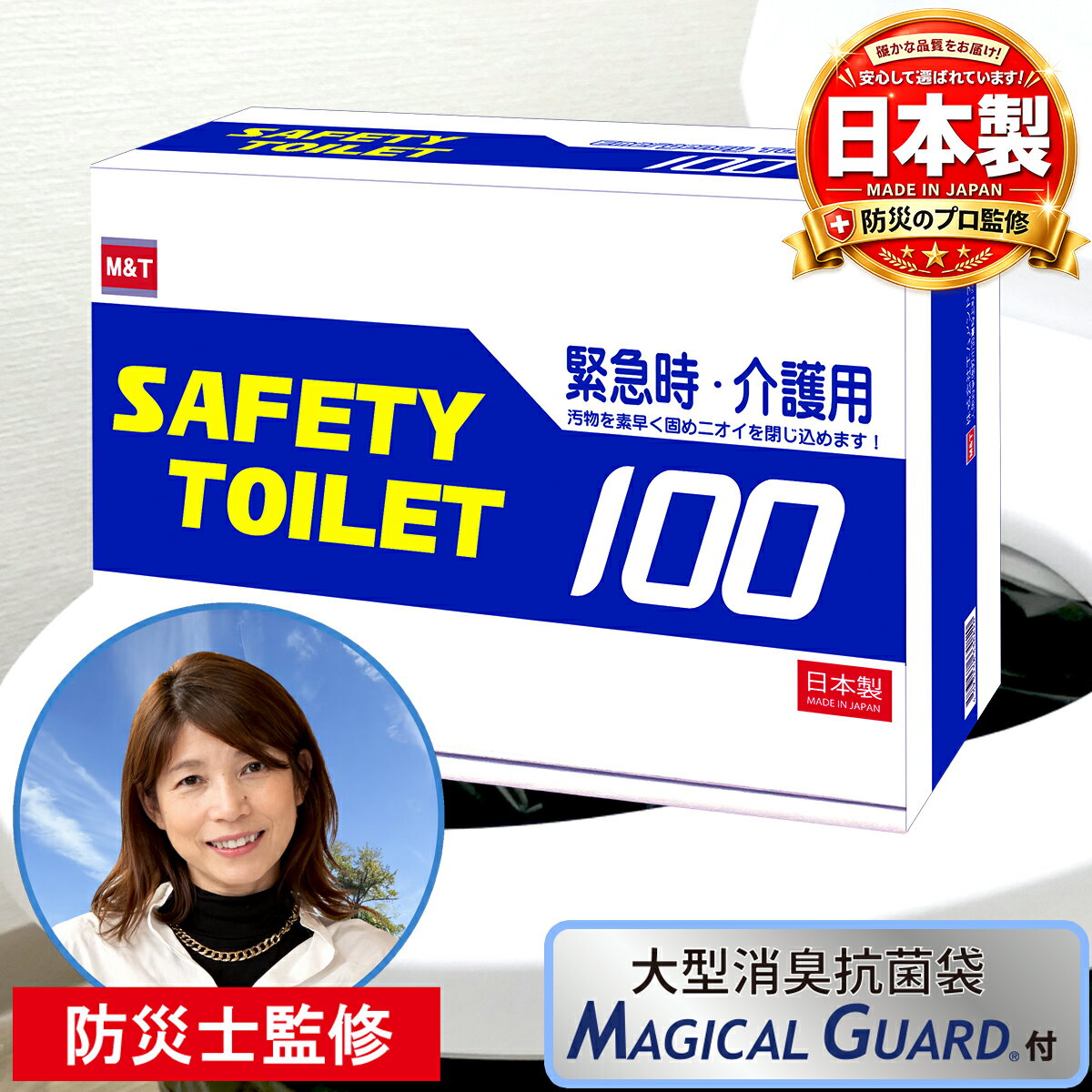 商品情報サ イ ズ〇 幅 29.7cm 奥行き 21cm 高さ11cm (重量:約2700g)素 材〇抗菌性凝固剤:高分子抗菌ポリマー〇排便袋(黒) 650ミリ×500ミリ:ポリエチレン〇大型消臭抗菌袋(乳白)650ミリ×800ミリ:ポリエチレン〇便座カバー(緑)650ミリ×500ミリ:ポリエチレン〇手袋(半透明フリーサイズ):ポリエチレン〇取扱説明書:紙内 容 品〇抗菌性凝固剤×100個(アルミパック)〇排便袋(黒)×100枚(10枚×10セット)〇大型消臭抗菌袋(MAGICAL GUARD)×10枚〇便座カバー(緑)×3枚〇ポリエチレン手袋×20枚〇取扱説明書×1枚商品説明SAFETY TOILET-100は地震などの災害時による断水時やドライブ中の渋滞・アウトドアや介護などの 緊急時の排泄問題を解消する為に開発された、水がなくても使用できる簡易トイレセットです。